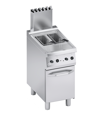 Deux cuves de 15 litres chacune, équipées d'une vanne de sécurité gaz contrôlée par une carte électronique avec un thermocouple de classe J, qui permet de réguler la température jusqu'à 190°C. Sécurité garantie par un thermocouple maintenu actif par la flamme du brûleur pilote. Indication sur le display de l'intervention du thermostat de sécurité. Le cycle de melting assure le contrôle électronique du chauffage de l'huile à intervalles programmés aussi bien pendant la phase de chauffage de l'huile (en cas d'utilisation d'une graisse solide) que pendant la phase de maintien de la température. Software qui garantit que la température programmée est atteinte exactement, en évitant le stress thermique de l'huile et son oxydation. Affichage de la température de l'huile dans la cuve en temps réel. Fonction de minuterie qui avertit l'utilisateur par un signal sonore lorsque le temps de cuisson prédéfini est atteint.