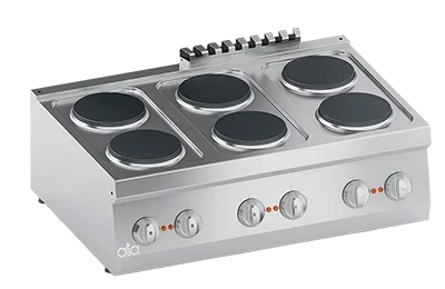 Chauffage obtenu par des plaques électriques rondes en fonte. Éléments chauffants fixés sur le fond de la plaque, noyés dans une couche de matériau isolant. Chaque plaque est munie d'un sélecteur qui permet de faire varier la puissance de chauffage du maximum au minimum dans sept positions. La sécurité est assurée par un interrupteur de température situé à l'intérieur de la plaque de cuisson.