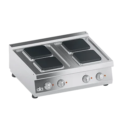 Chauffage obtenu par des plaques électriques carrées en fonte. Éléments chauffants fixés sur le fond de la plaque, noyés dans une couche de matériau isolant. Chaque plaque est munie d'un sélecteur qui permet de faire varier la puissance de chauffage du maximum au minimum dans sept positions. La sécurité est assurée par un interrupteur de température situé à l'intérieur de la plaque de cuisson.