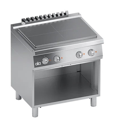 Plan de cuisson à coins arrondis en acier spéciale résistant aux hautes températures. Equipé de quatre zones de cuisson indépendantes, chacune d'entre elles étant équipée d'un thermostat, qui permet de faire varier la puissance de la chaleur du maximum au minimum.